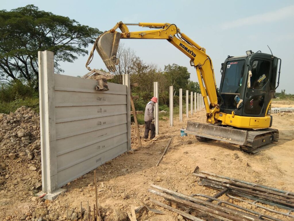 2. ติดตั้งแผ่นรั้ว – ยกแผ่นคอนกรีตสำเร็จรูป (หนักราว 70 กก.) เสียบเข้ากับเสา ใช้แรงงานหรือเครื่องทุ่นแรงอย่างรถแม็คโคร/เครนช่วยได้